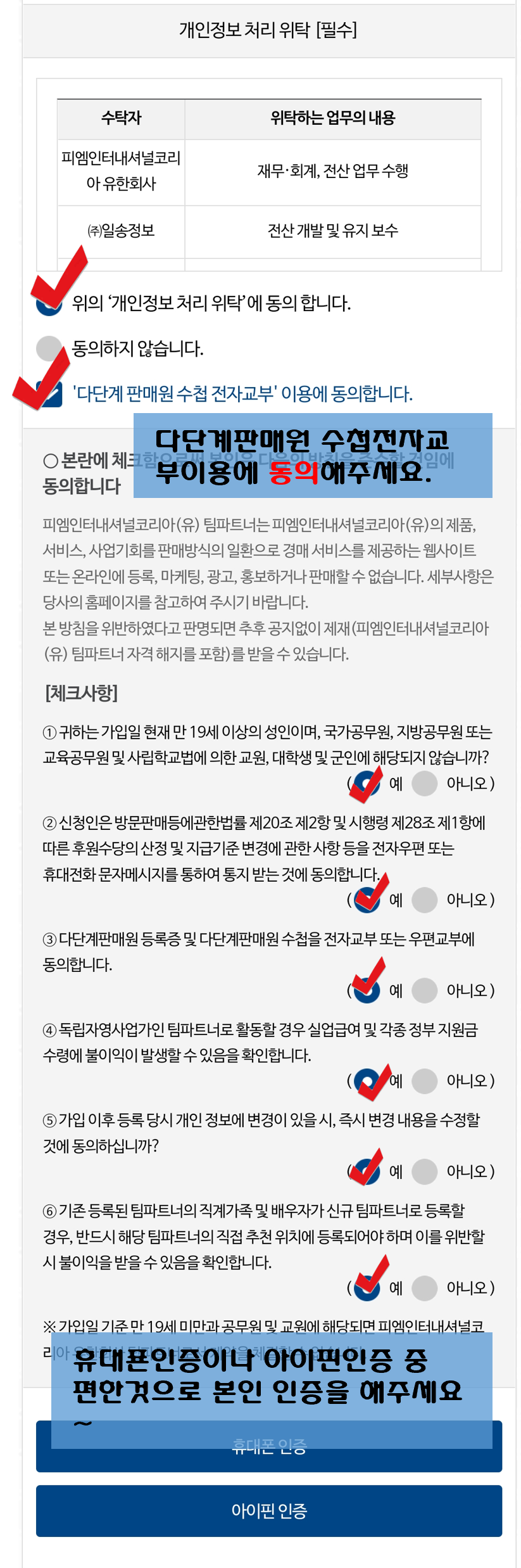 7. 개인정보 처리 위탁에 동의, 다단계 판매원 수첩전자교부에 동의해주세요.